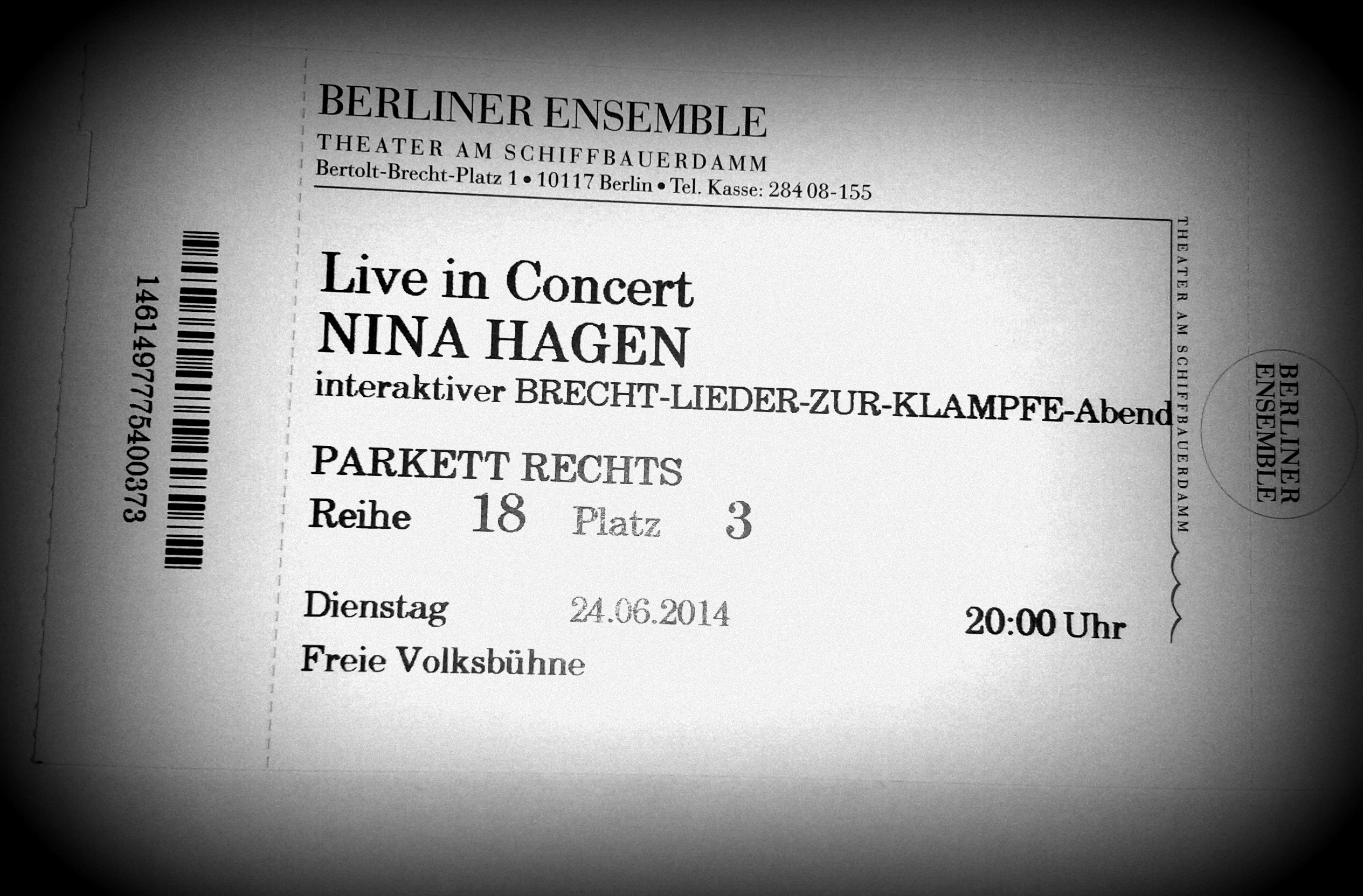 Концерт проходил в Берлинер Ансамбль (Berliner Ensemble) — маленьком и потрясающе красивом и уютном театрике. Именно здесь, как выяснилось, сидя где-то на галерке, маленькая Нина познакомилась с творчеством и философией Брехта, впервые услышала те песни, которые на концерте исполнила нам.