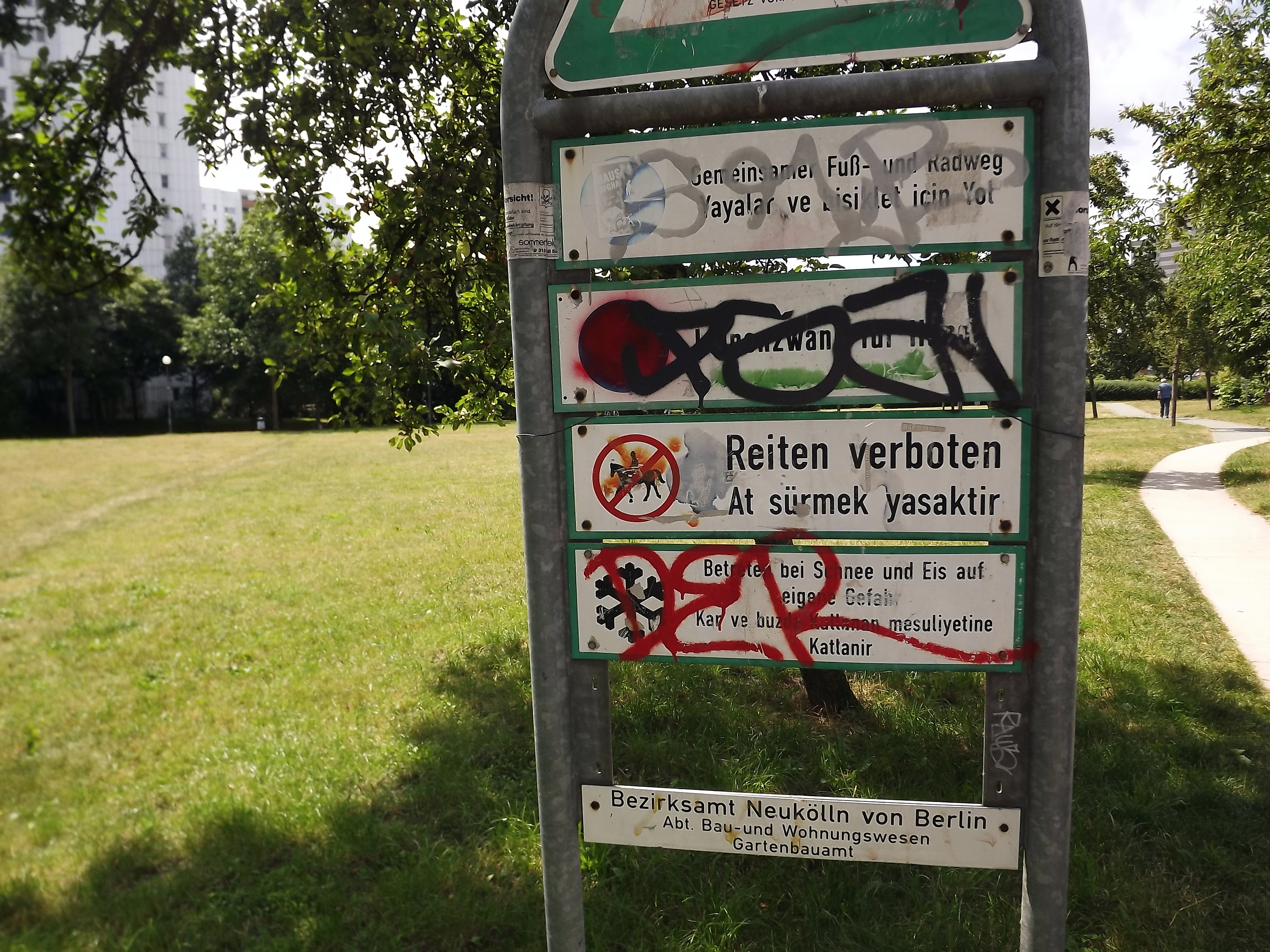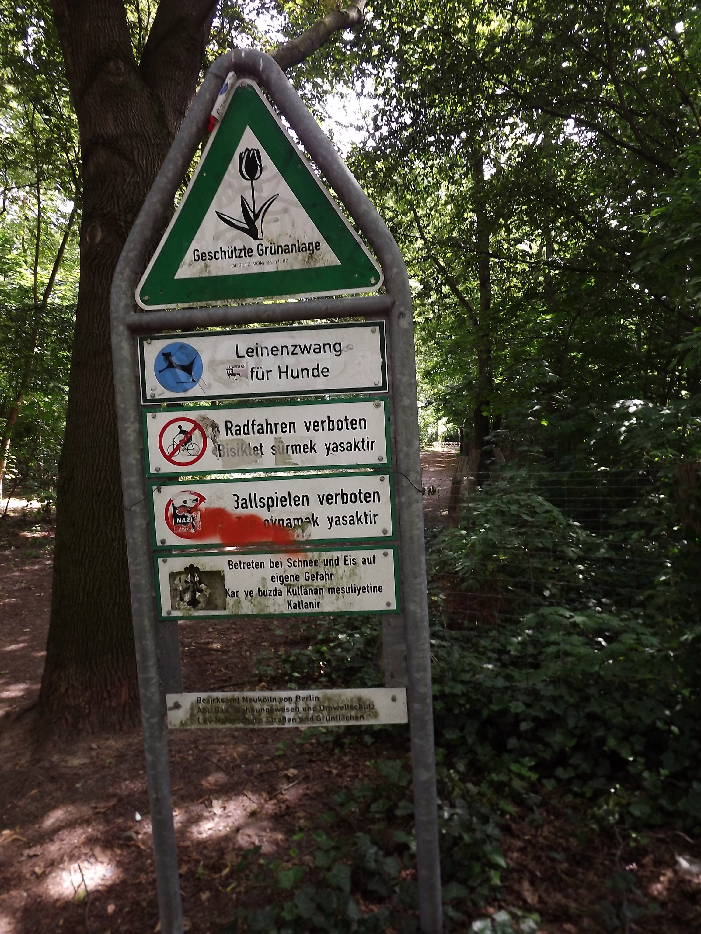 Увидев эту табличку при входе в маленький лесок, я вспомнила другую цитату Критианы Ф.: «Verboten zum Beispiel war, irgendetwas zu tun, was Spaß machte. Es war überhaupt eigentlich alles verboten.» «Например, было запрещено делать то, что приносило удовольствие. По большому счету вообще всё было запрещено.» Действительно ,почему нельзя было бы играть в мячик или ездить на велосипеде в лесочке?