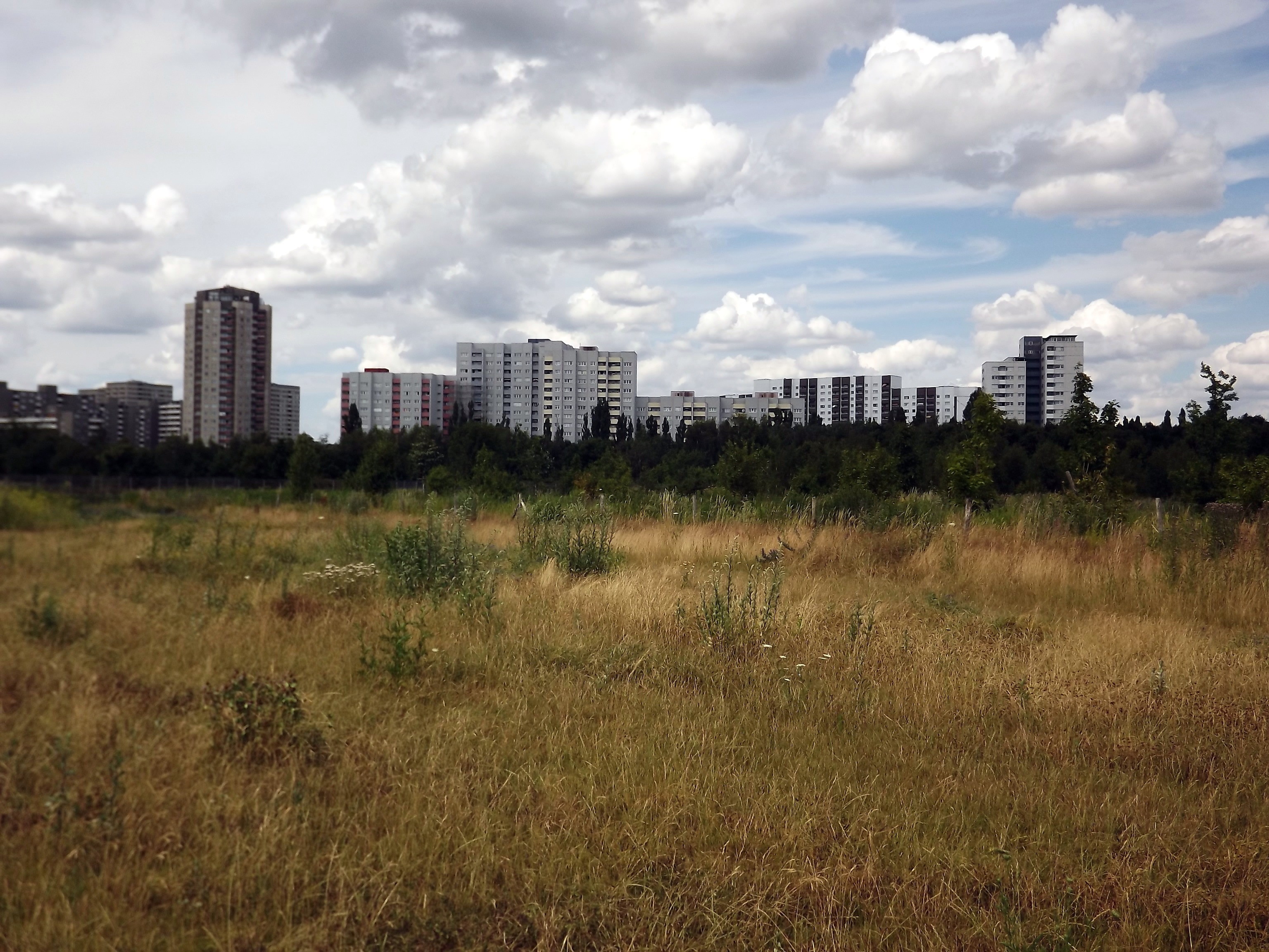 Стена проходила буквально в пяти минутах ходьбы от жилых кварталов. Вот вид на Гропиусштадт с востока.
