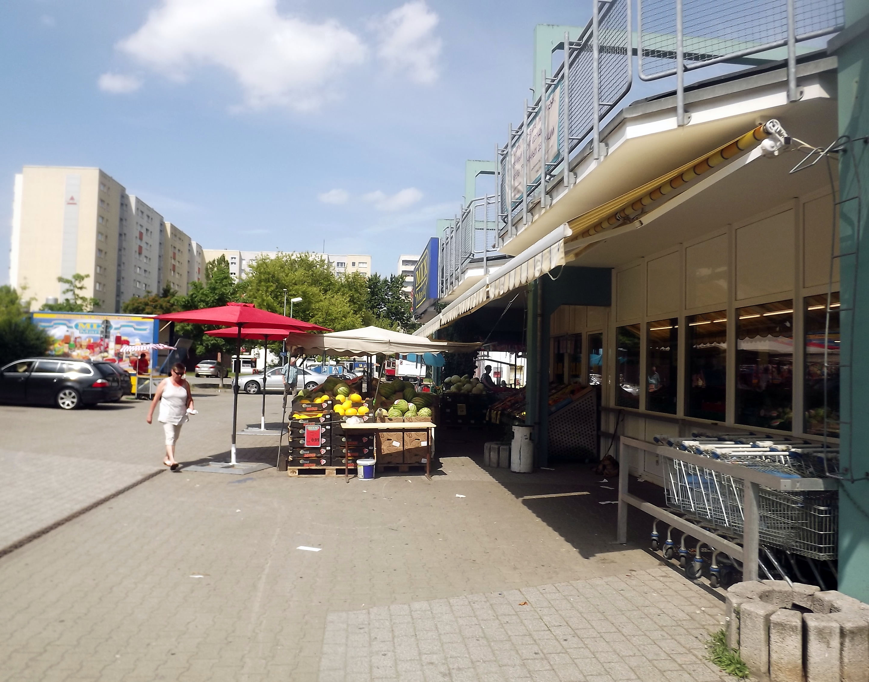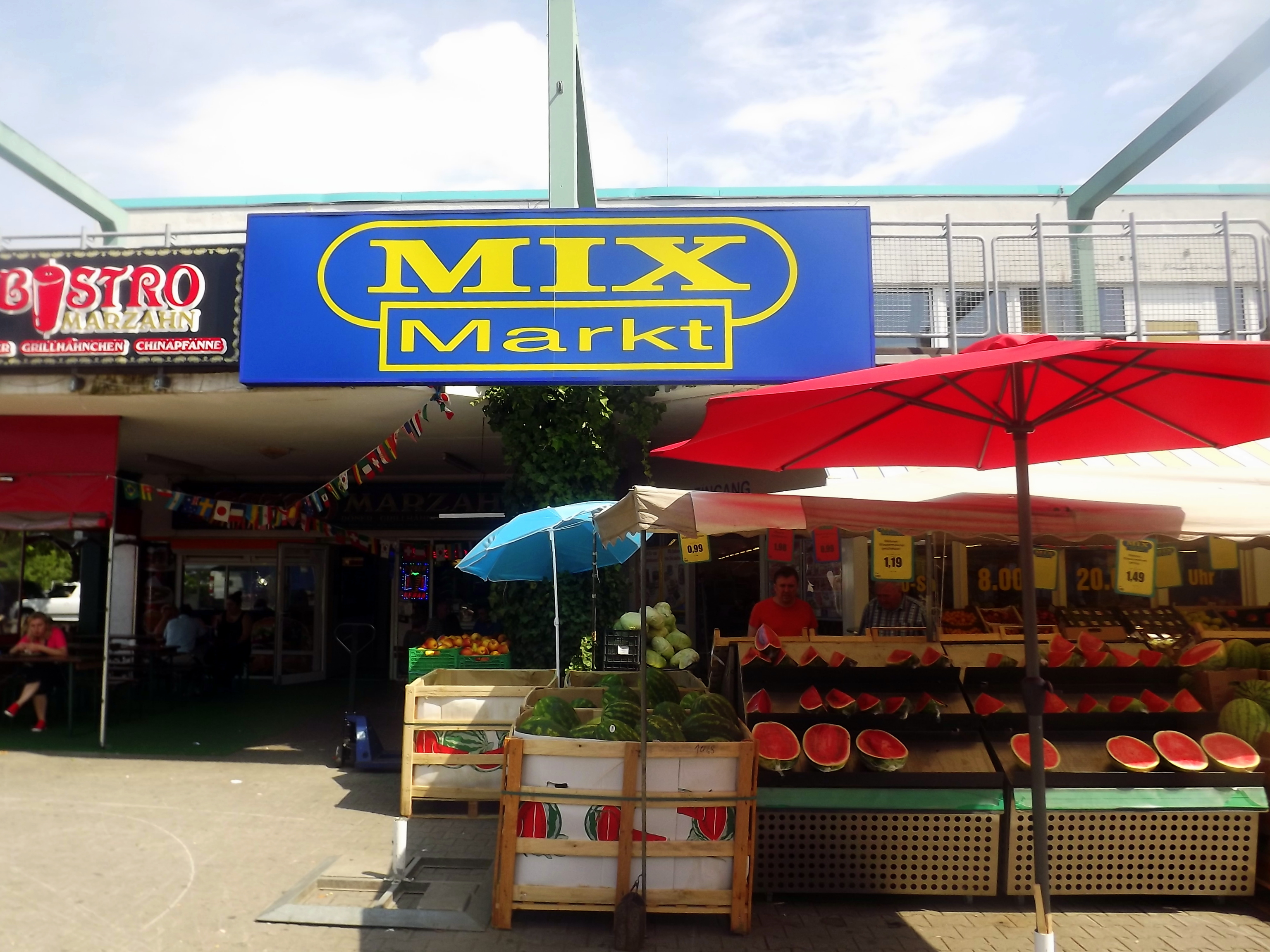 Микс Маркт — это, наверное, самый большой русский супермаркет в городе, и закупаются в нём — ожидаемо — в основном бывшие жители стран СНГ. Давненько я видела красномордых опухших русскоговорящих алкашей, на фоне павой плывет нарядная девушка на высоченных каблуках, ради похода в магазин набившая локоны и сделавшая парадный макияж.